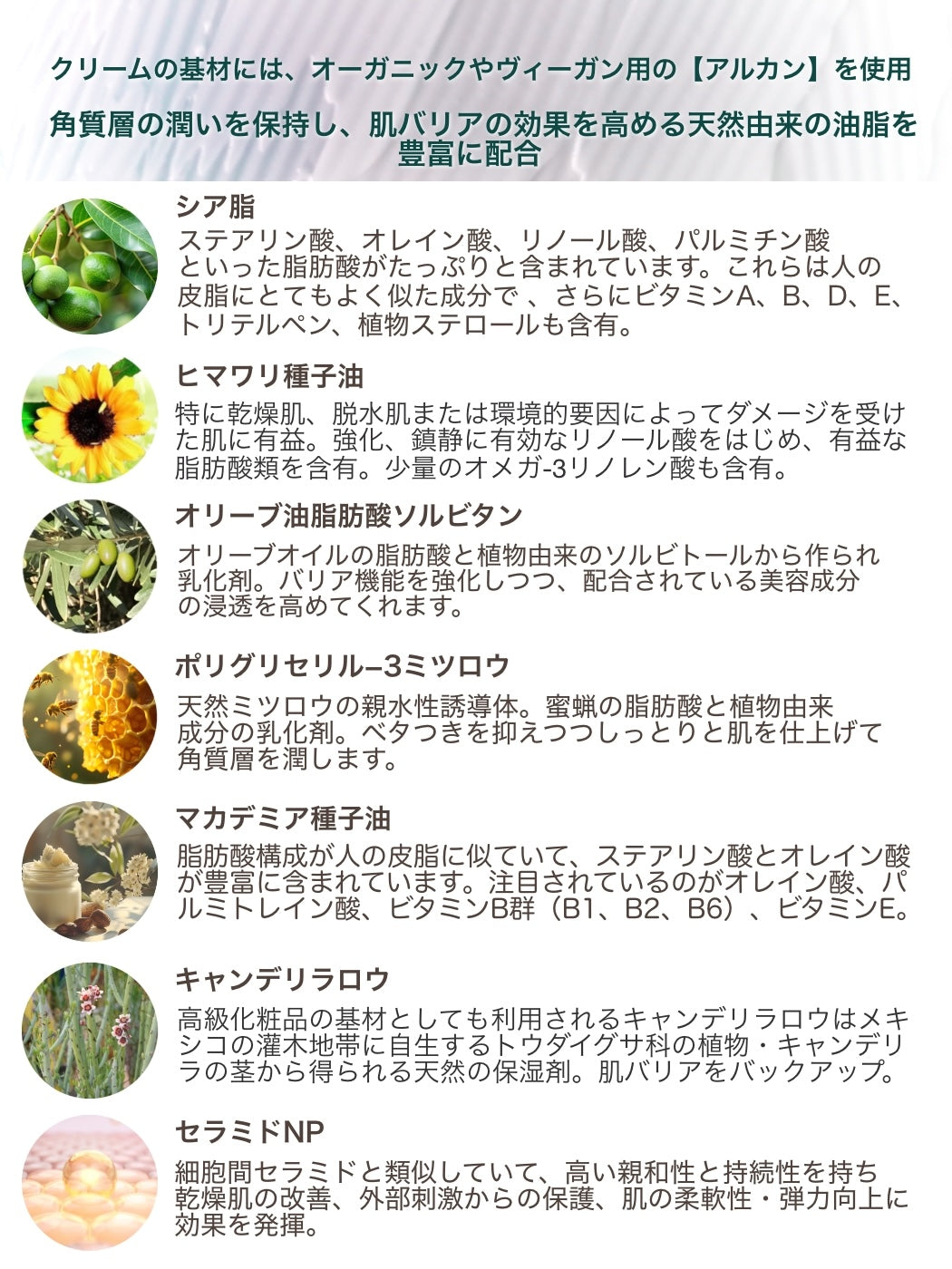 全成分 : 水、(C15-19)アルカン、野菜油、シア脂、オレイン酸デシル、セテアリルグルコシド、グリセリン、トリ脂肪酸(C10-18)グリセリル、オクチルドデカノール、ヒマワリ種子油、オリーブ油脂肪酸ソルビタン、ポリグリセリル-3ミツロウ、ステアリン酸グリセリル、香料、ペンチレングリコール、セチルリン酸K、マカデミア種子油、1,2-ヘキサンジオール、セテアリルアルコール、ベンジルアルコール、水添野菜油、クロルフェネシン、酢酸トコフェロール、パルミチン酸セチル、ココグリセリル、スクレロチウムガム、ラミナリアディギタータエキス、キャンデリラロウ、クリスマムマリチマムエキス、トコフェロール、海塩、セラミドNP、クエン酸、安息香酸Na、ワカメエキス、クエン酸水添野菜脂肪酸グリセリズ、ダイズ油