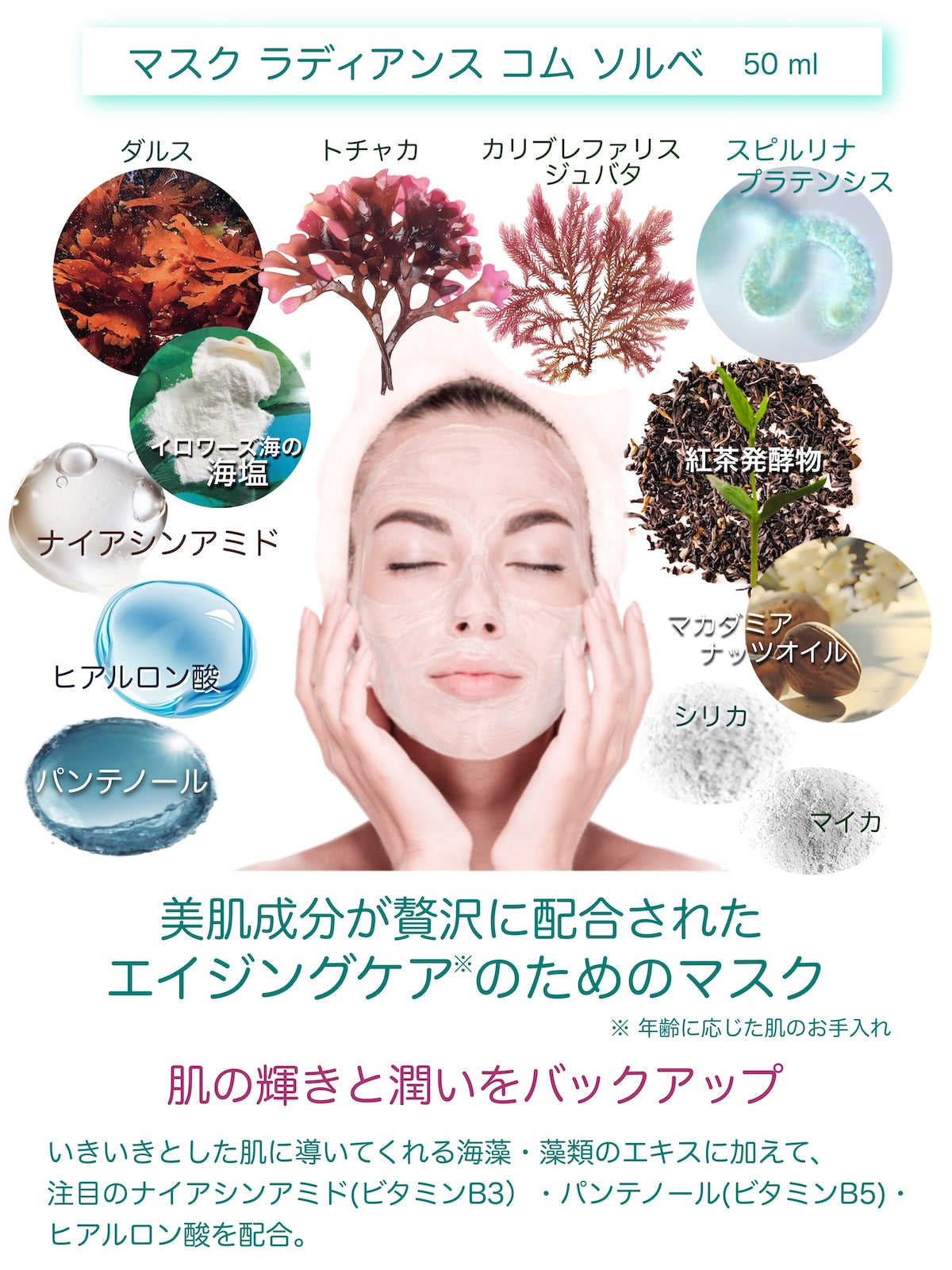 ミネラル・ビタミンB類・アミノ酸類を豊富に含有する藍色藻類スピルリナ、大西洋に生息する海藻カリブレファリス・トチャカ・ダルスから抽出した美肌成分が豊富に配合された贅沢なマスク。
